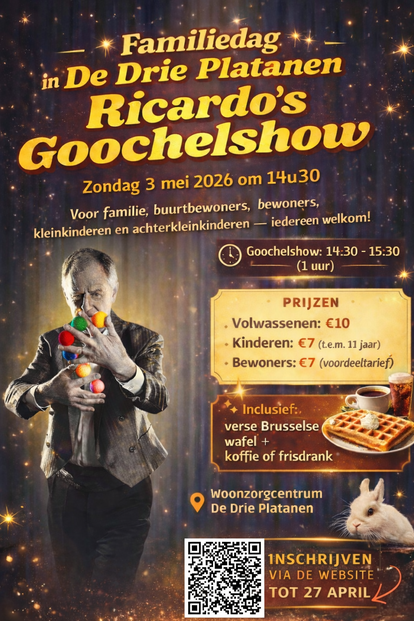 Tijdens deze middag kunnen jullie samen met bewoners en (klein)kinderen genieten van Ricardo's goochelshow. Het belooft een gezellig uurtje vol verbazing te worden voor bewoners en hun familie.
